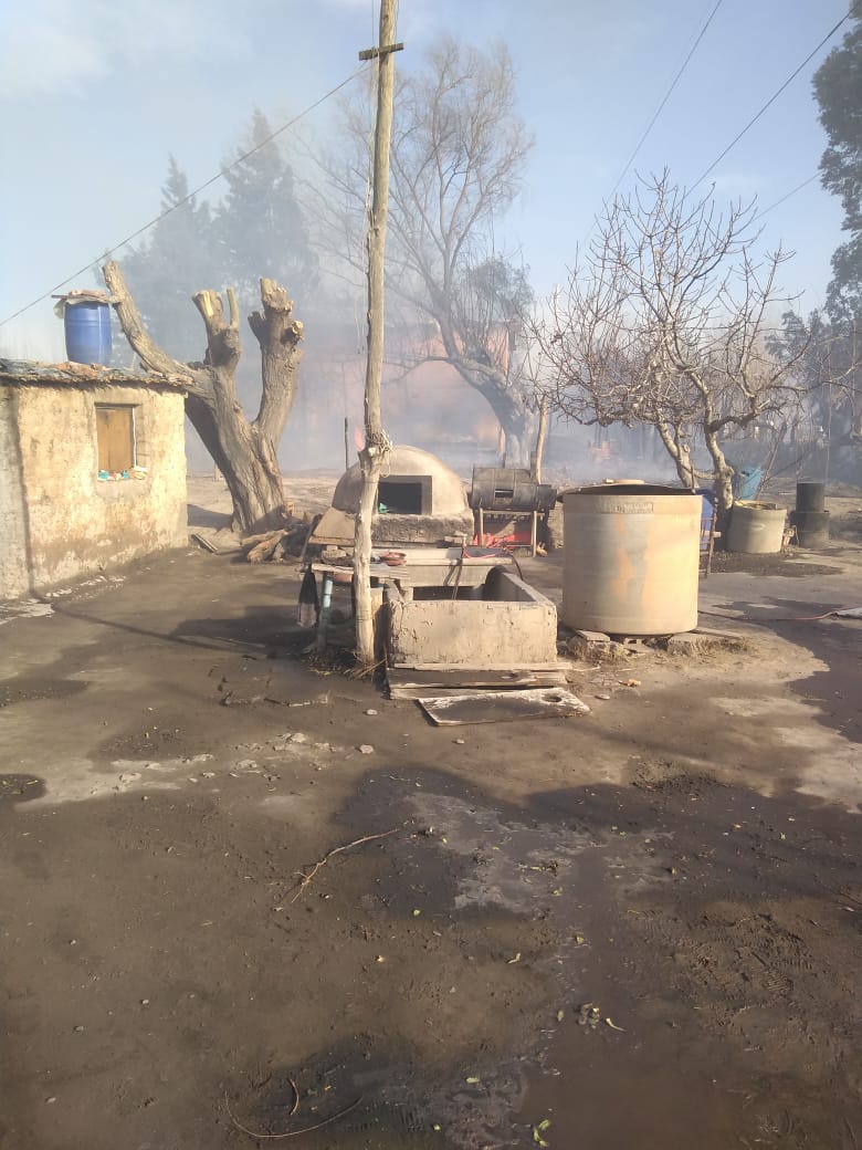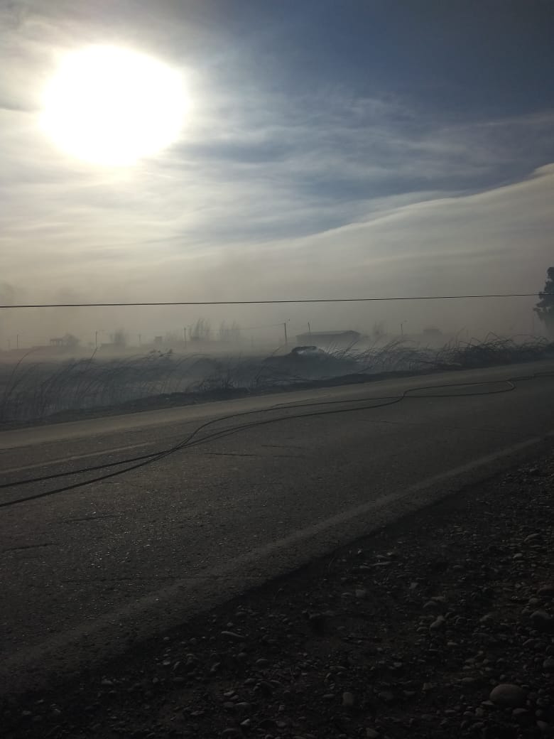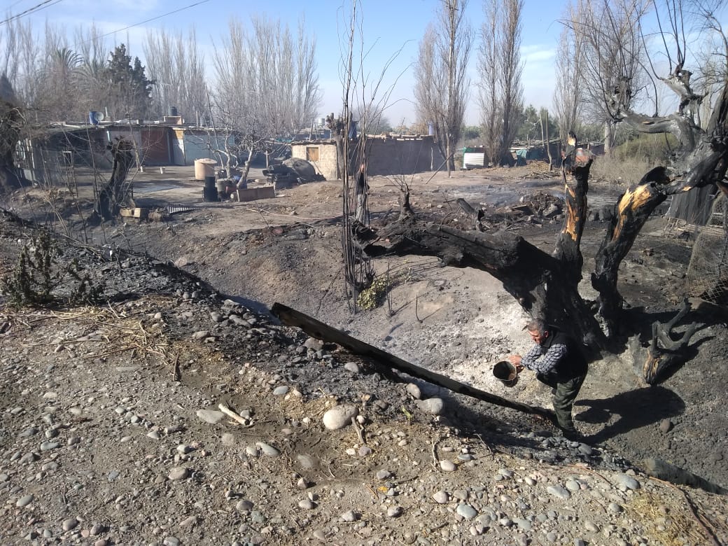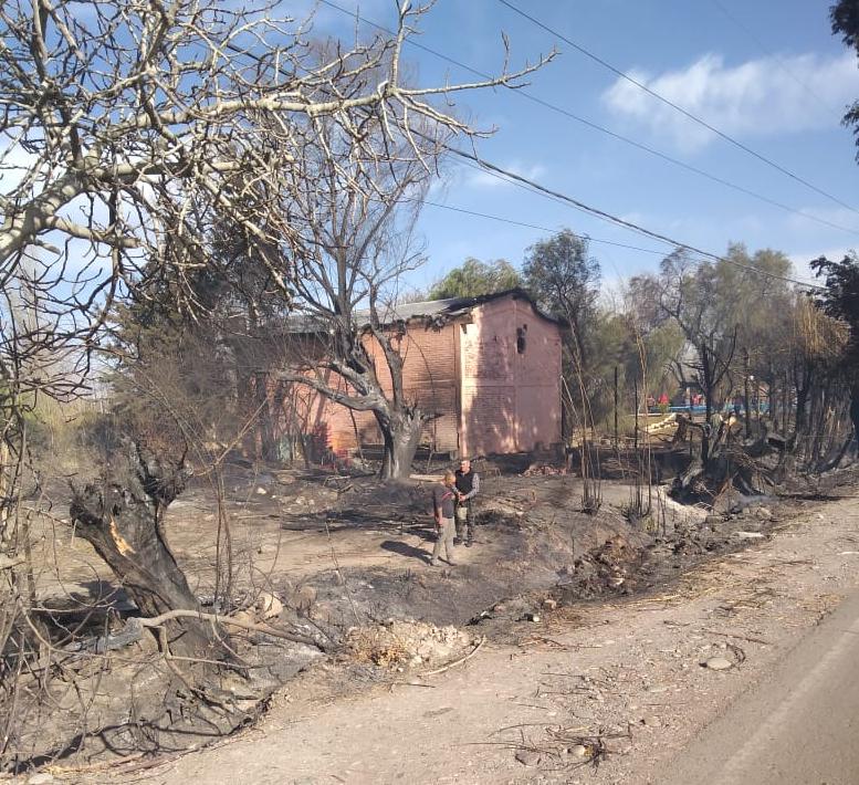 Lo que se temía, finalmente ocurrió. El fuego que en principio afectaba sólo a pastizales, fue creciendo alimentado por el fuerte viento Zonda y llegó hasta viviendas ubicadas en la zona de Ruta 155 y calle Ramón Franco, en Médano de Oro.