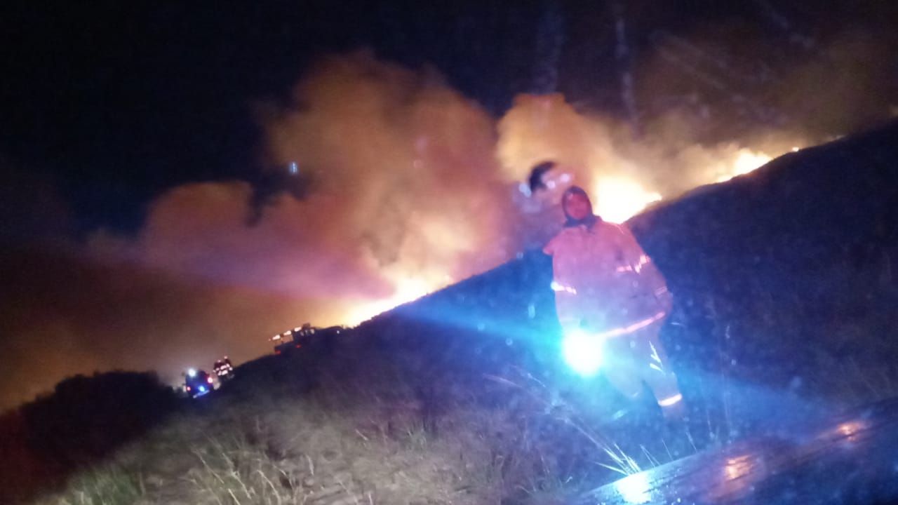 Dos dotaciones de Bomberos trabajaron intensamente anoche para evitar que las llamas de un incendio forestal alcanzaran una escuela, en Pocito.