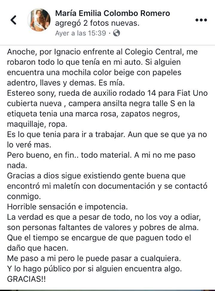 El miércoles en la noche, la exreina del Sol María Emilia Colombo fue víctima de un robo, frente al Colegio Central Universitario, ubicado en avenida Ignacio de la Roza pasando Ameghino, en Capital.