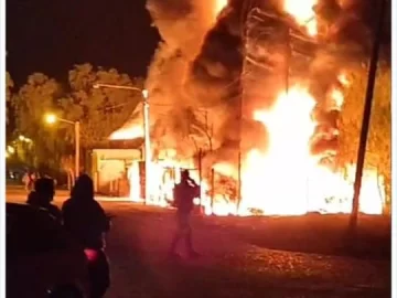 Vecinos de Sarmiento se vieron sorprendidos anoche por el impresionante incendio en el interior de una fábrica de bolsones de cal. El lugar fue consumido por las llamas por completo, informaron desde la Comisaría Soria.