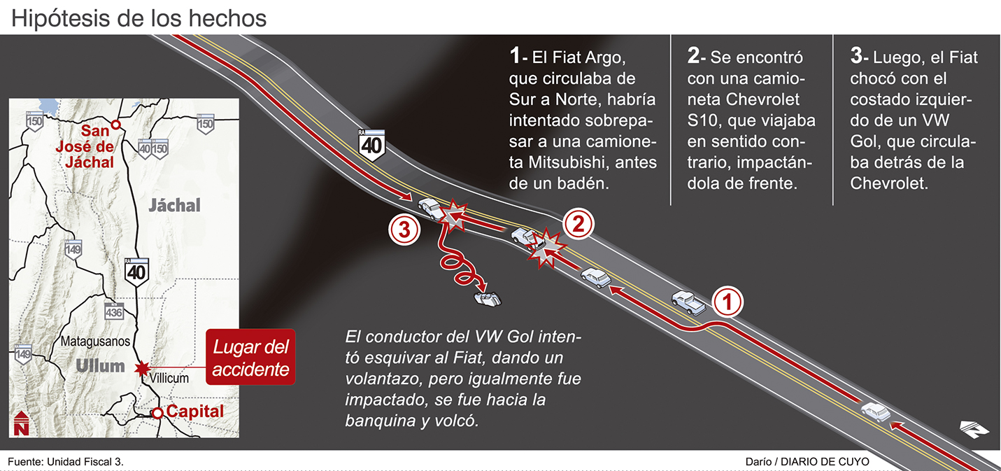 Su testimonio alimentó la principal hipótesis sobre el origen del desastre. Según voceros del caso, todo indica que Rodríguez intentó sobrepasar la camioneta Mitsubishi en pleno ascenso, previo a un badén. Y que ahí chocó con la Chevrolet S-10 guiada por Noguera y luego con la parte trasera izquierda del Gol Trend de Cortez.