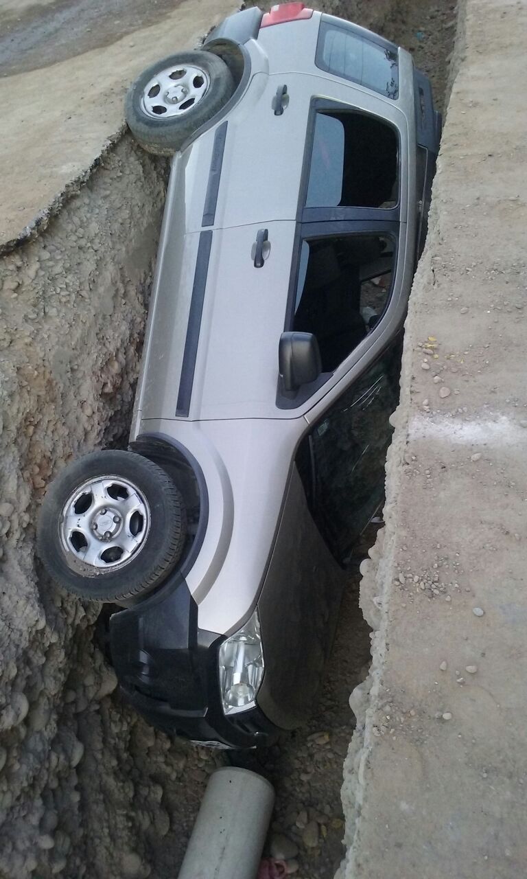 En la zona están realizando la obra de instalación de las cloacas y la camioneta cayó de costado al hueco. La conductora, identificada como Alejandra Sisterna, aseguró que se encandiló y debido a eso perdió la noción del límite del borde.