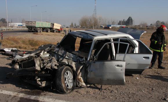 Un matrimonio a bordo de un Peugeot 504 se salvó de lo peor ayer luego de protagonizar un impresionante choque contra un camión con acoplado en el siempre peligroso cruce de la Ruta Nacional 20 y Belgrano, en el monumento al Gaucho, Santa Lucía. La pareja sufrió quebraduras en sus extremidades superiores, pero estaban fuera de peligro, informó la Policía.