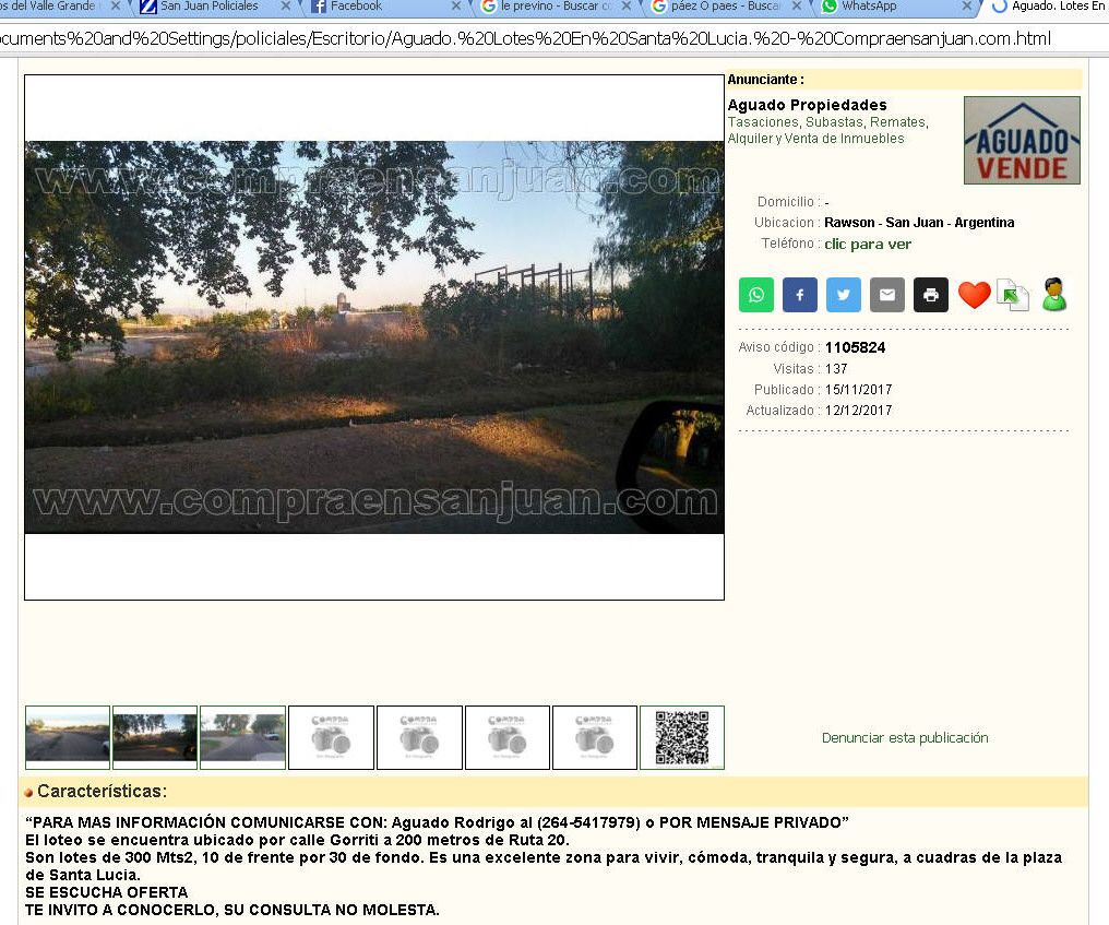 El matrimonio de apellido Páez vio ese aviso en noviembre último y se contactó con Aguado, quien le mostró el terreno situado en calle Gorriti cerca de ruta 20, Santa Lucía, y le exhibió documentación, indicaron en la Policía. Según las versiones, el mismo Aguado después presentó a Celeste Molina, que andaba siempre con Copolella, como la dueña del lote y posteriormente acordaron con los Páez la venta del terreno a 350.000 pesos. Como parte de pago, la familia entregó un auto Volkswagen Surán valuado en 180.000 pesos y además 170.000 pesos en efectivo para cancelar la deuda.