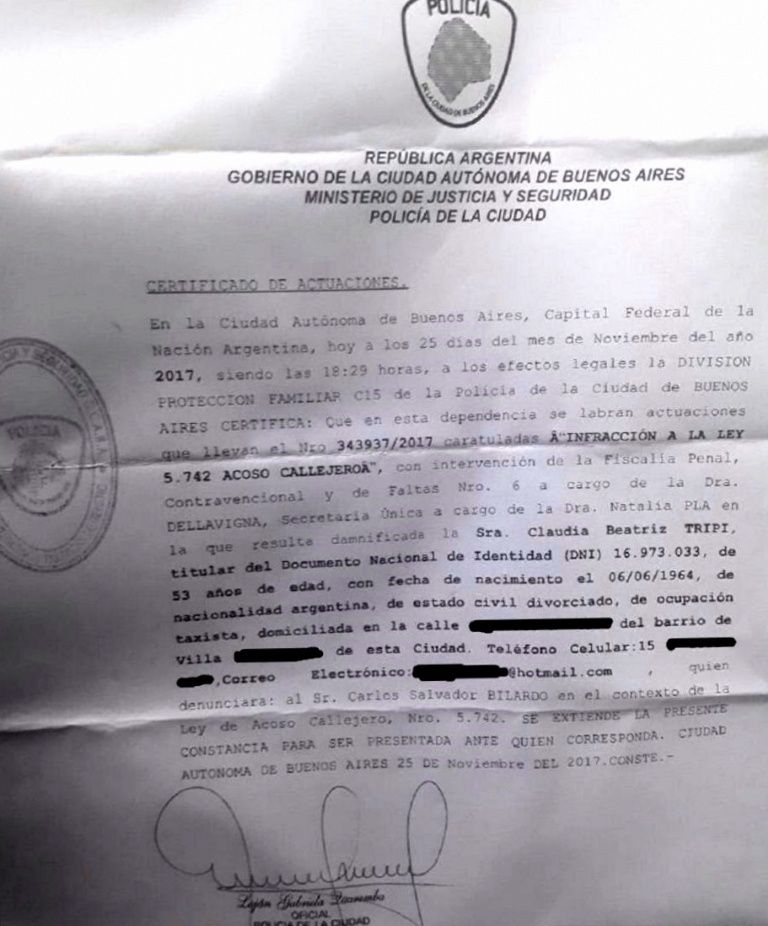 Claudia Tripi, de 53 años, chofer de taxi, denunció a Bilardo por Acoso Sexual en el marco de la Causa N° 343937/2017 caratulada “BILARDO, CARLOS SALVADOR S/ INFRACCIÓN A LA LEY 5.742 ACOSO CALLEJERO”, la cual fue realizada en la División Protección Familiar de la Ciudad de Buenos Aires.