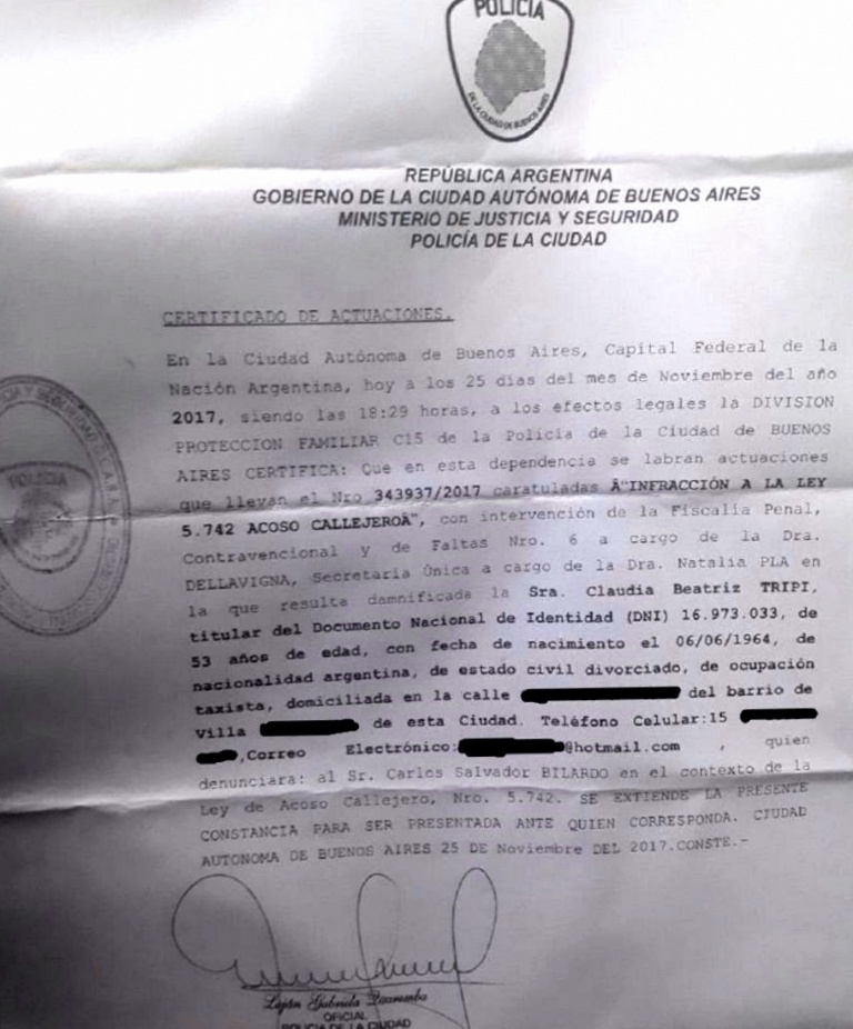 Claudia Tripi, de 53 años, chofer de taxi, denunció a Bilardo por Acoso Sexual en el marco de la Causa N° 343937/2017 caratulada “BILARDO, CARLOS SALVADOR S/ INFRACCIÓN A LA LEY 5.742 ACOSO CALLEJERO”, la cual fue realizada en la División Protección Familiar de la Ciudad de Buenos Aires.