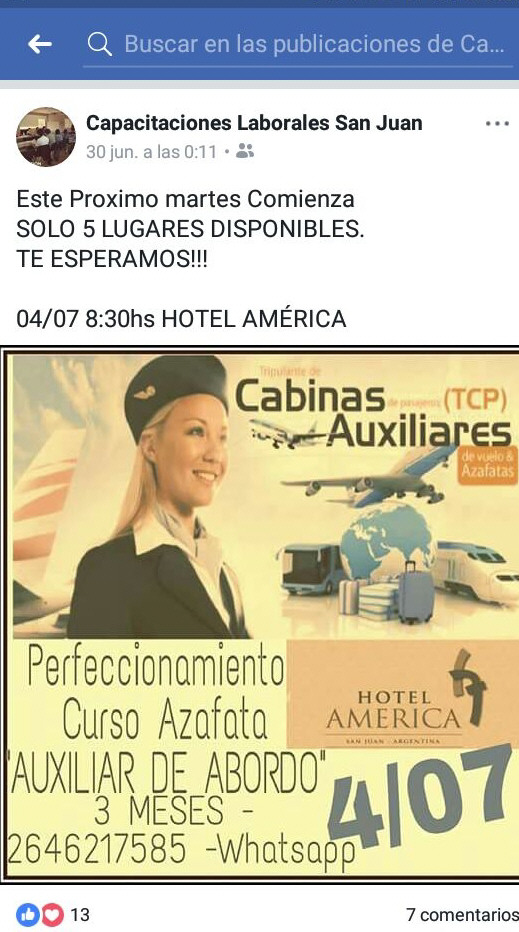 Denuncian que la tal Julieta atendía en dos oficinas en Capital, que luego cerraron. Los cursos se dictaban los martes a la mañana en un salón del Hotel América y de las 11 materias que debían tener, sólo dieron Inglés, Primeros Auxilios y Aeronáutica. Eso generó malestar en los alumnos que empezaron a sospechar; además, todo era poco serio: el recibo era un papel cualquiera con una firma sin sello y la única cara visible era la tal Julieta. Fue así que hicieron averiguaciones en la ANAC (Administración Nacional de Aviación Civil) y el CENEAS ( Centro Nacional de Estudios Aeronáuticos), donde le respondieron que no tenían actividad en la provincia y ni avalaban actividad educativa, comercial o administrativa a través de terceros.