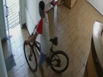 Sin personas en la zona de recepción, el delincuente pasó por la vereda y sin dudar, ingresó. En las imágenes se ve cómo camina hacia la puerta, mira para todos lados y vuelve a pasar hacia la parte de atrás, para luego aparecer en la cámara montando la bicicleta.