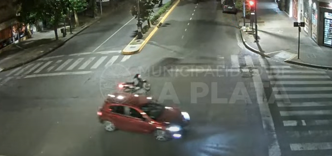 Las cámaras del Centro de Operaciones y Monitoreo de la Municipalidad de La Plata registraron el momento del impacto. Allí se observa que la moto, manejada por un servicio de delivery, circulaba por avenida 44, pasó el semáforo en rojo e impactó contra el automóvil que cruzaba dicha arteria sobre calle 3.