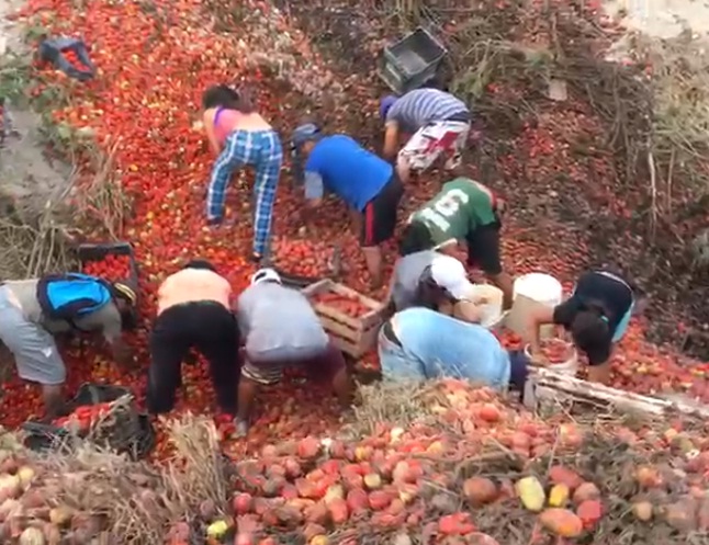 Hombres y mujeres, encima de los tomates, seleccionaron los que mejores estaban y los fueron separando en cajones que luego acarreaban hacia la superficie, ya que toda la cosecha quedó tirada en un profundo zanjón del lugar, según se puede ver en las imágenes que capturó Diario de Cuyo.