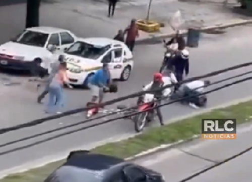 Quien manejaba la moto se llevó la peor parte. El video muestra cómo le pegaron cuando ya estaba completamente indefenso en el piso. El cómplice quiso huir a pie por la avenida a toda velocidad. No llegaría muy lejos.