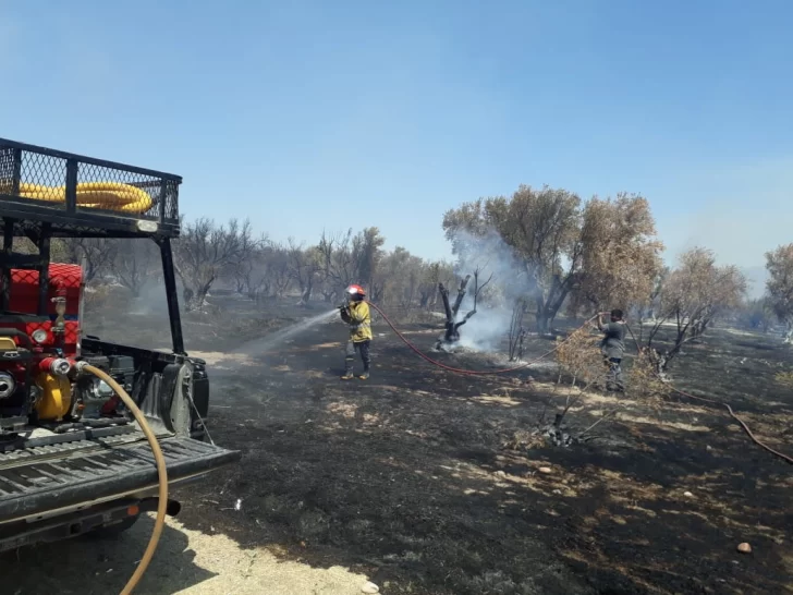 Durante la tarde de este jueves, un incendio de proporciones considerables afectó a Pocito. Más precisamente, ocurrió en calle 7 y San Miguel, donde está ubicado un olivar, con sus respectivos galpones. Todo fue consumido por el fuego, salvo las estructuras.