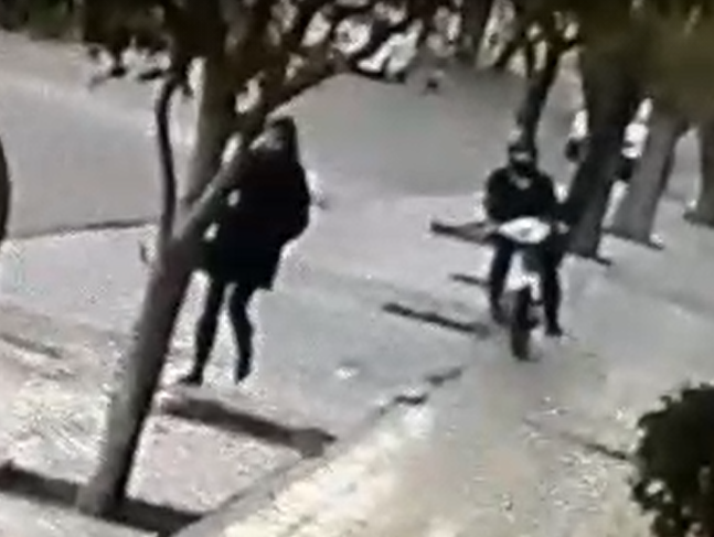En las imágenes se advierte cómo el motochorro pasa frente a la cámara y se detiene a metros de allí, aguarda unos segundos y aparece la víctima caminando por la vereda contraria.
