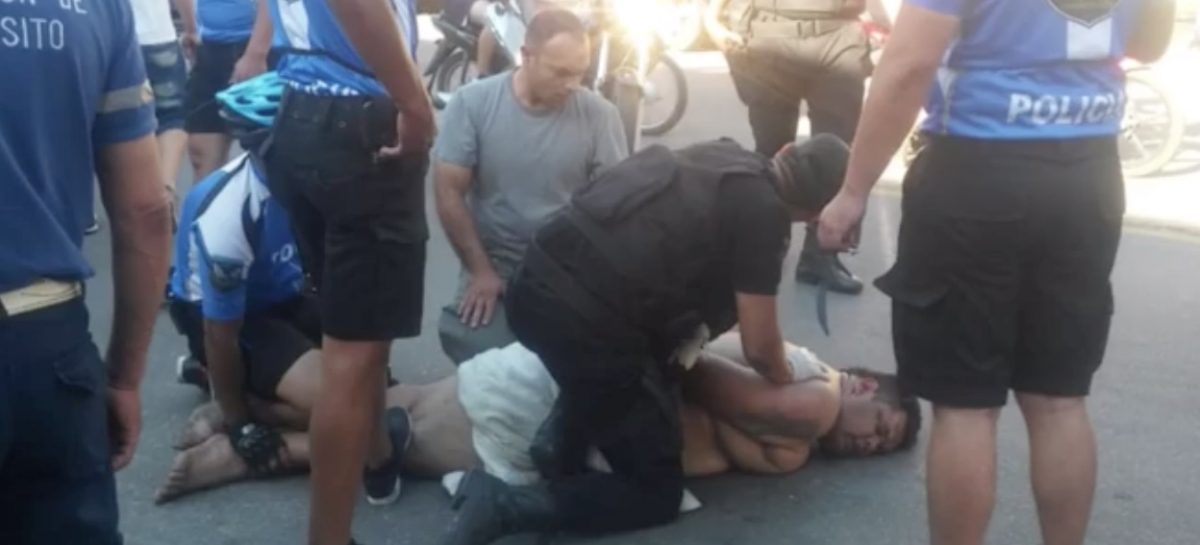 La policía intentó frenarlo y uno de los uniformados fue atacado a golpes de puño por Amado quien finalmente fue detenido.