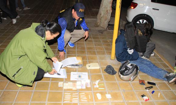 Dos jóvenes, de 18 y 16 años, a bordo de una moto fueron detenidos ayer en la tarde por policías de la delegación local de la Policía Federal con 16 “porros”, una bocha de marihuana y $229 en Ignacio de la Roza, al Oeste de Mendoza, en pleno microcentro. Fuentes de esa Fuerza informaron que ambos vendían esa droga en la Plaza 25 de Mayo.
