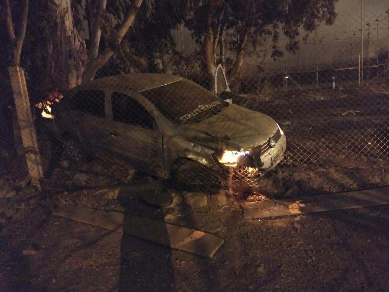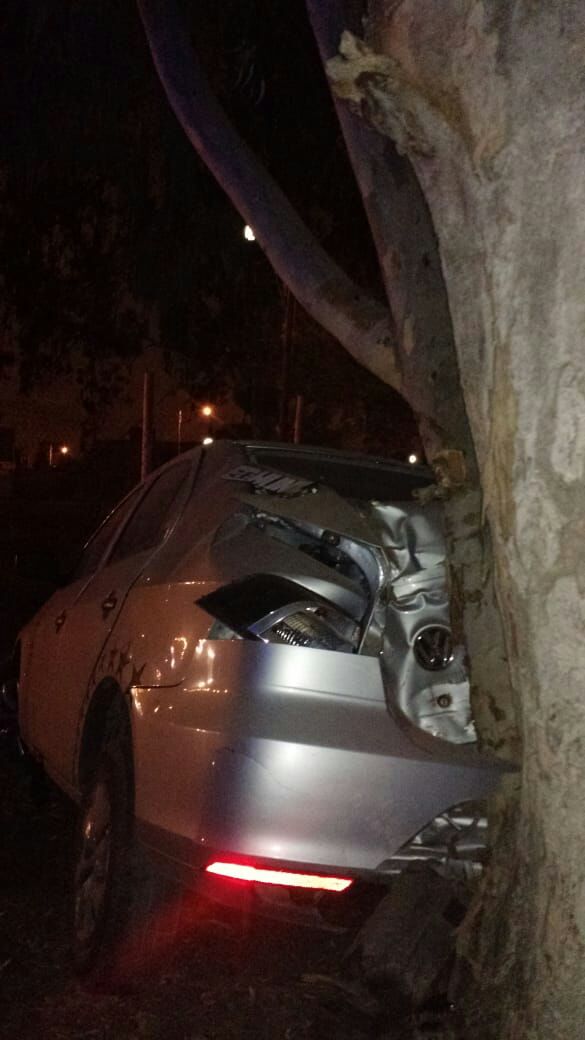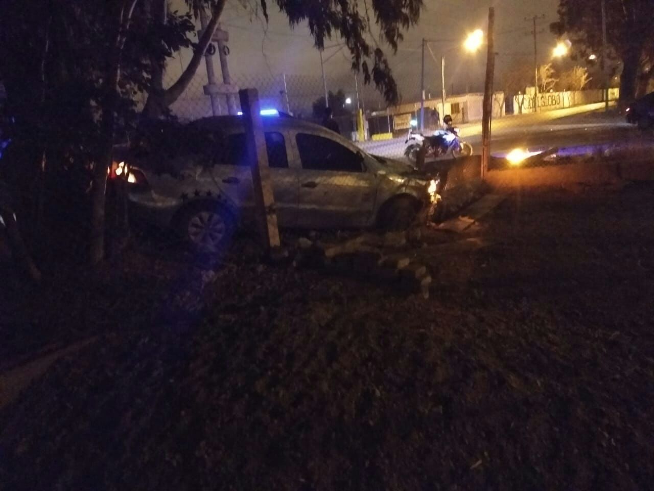 Durante los primeros minutos de la mañana de hoy se produjo un accidente de tránsito sobre calles Cabot y Meglioli, en Rivadavia. Según informaron testigos del hecho, el Volkswagen se trasladaba a alta velocidad por Meglioli cuando impactó contra el cartel de "dirección obligatoria". El conductor quiso doblar, pero chocó contra un eucalipto primero y contra una medianera después.