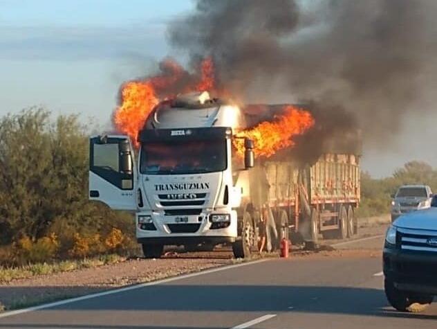 Este domingo por la tarde, un chofer se salvó de sufrir heridas luego de que el camión que conducía cargado con fruta hacia la feria de Rawson se incendiara.