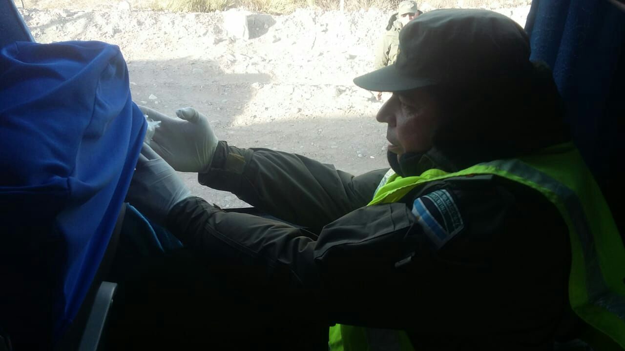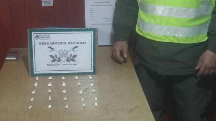 Este martes, personal de Gendarmería descubrió a un pasajero de un colectivo que viajaba por la Ruta Nacional 149, a la altura de Iglesia, con 25 dosis de cocaína escondidas en la cabecera del asiento de adelante del suyo.
