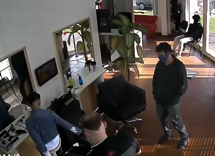 Las imágenes de la cámara de seguridad del negocio muestran cómo, después de terminar el corte y mientras el estilista guarda sus elementos, es el chico quien se acerca a su padre, le entrega la pistola y el hombre amenaza al peluquero para que le dé la recaudación de la caja.