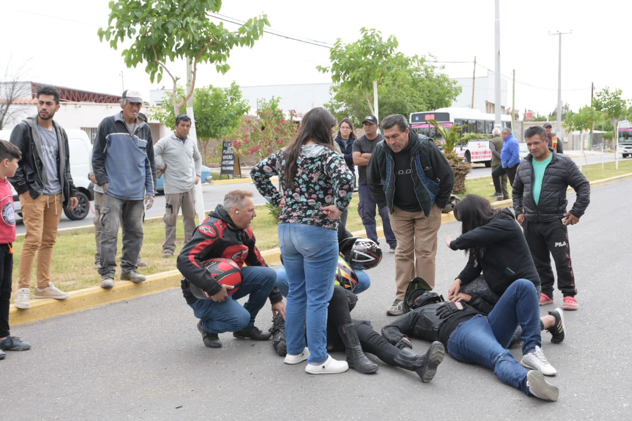 Vecinos de la zona se acercaron a socorrerlos mientras aguardaban la llegada de la ambulancia, que luego trasladó al conductor de la moto al Hospital Rawson.