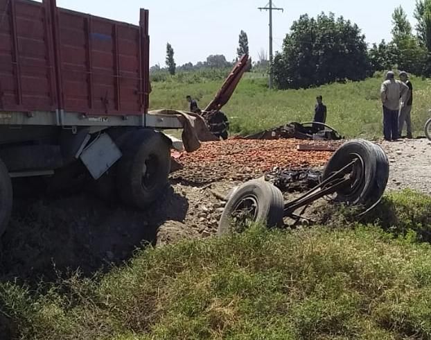 Según informaron testigos, el siniestro vial se produjo pasadas las 12. Aparentemente un viejo camión sufrió la rotura de un neumático, posteriormente se desarmó al perder el eje delantero y, como si fuera poco, toda la carga de tomates que transportaba quedó en el suelo.