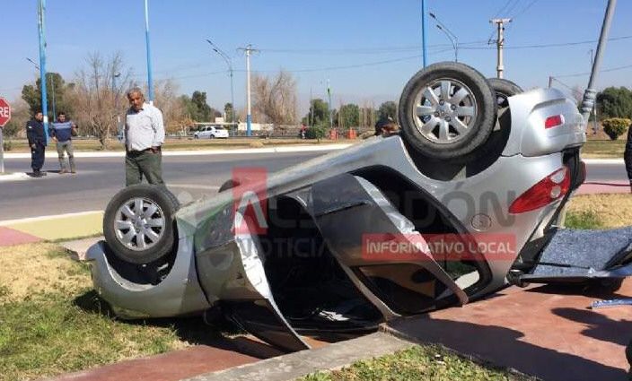 Una mujer de apellido Terussi (36) y su hija de 6 años se salvaron de lo peor al volcar en un auto Peugeot 207 en la rotonda de ingreso a Albardón, cerca de las 13.30 de ayer, dijeron fuentes policiales. Al parecer, Terussi perdió el control, se fue contra el cordón de la rotonda y volcaron. Foto: Albardón Noticias.