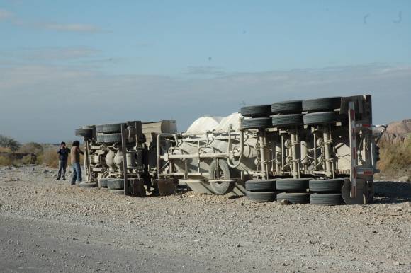 El peso de la carga y no conocer bien esa curva pronunciada de la ruta 40. Esas serían las dos razones que dio a la policía un camionero chileno cuando lo rescataban con un ocasional pasajero del interior de la cabina, tras volcar y quedar afortunadamente a salvo. Y es que ese conductor que transportaba 28.000 kilos de cal viva en un camión Volvo desde Jáchal a Mendoza, con destino final al país trasandino, no llegó a destino porque volcó en una peligrosa curva del cerro El Villicum, en Ullum. El chofer no pudo dominar el pesado vehículo y se fue hacia la banquina Oeste. El rodado se puso de costado en un tramo de ruta donde hay un socavón producido por las crecientes, y de costado recorrió unos 20 metros hasta que finalmente se detuvo, sin desparramar la carga dijeron en la policía.