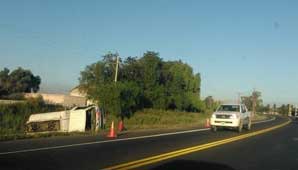 San Juan, 6 de diciembre.- Durante la mañana de hoy, minutos después de las 6, un camión destinado al transporte de combustible volcó en Ruta 20 antes del cruce con calle La Plata, de Caucete.