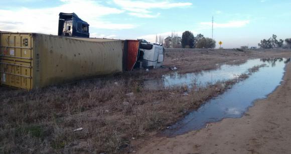 Cientos de litros de vino blanco terminaron derramados ayer a las 5.30 a un costado de la ruta 40, en Sarmiento, después de que volcara un camión que llevaba dicha carga a Mendoza. El accidente involucró al chofer mendocino Fabián Zalazar (45), quien contó a la Policía que perdió el control del camión Renault con semiacoplado por esquivar a un perro. Esto pasó en el km 3.399, cerca de San Carlos. El vehículo transportaba botellas con vino blanco de origen sanjuanino que iba a ser etiquetado en Mendoza, dijeron.