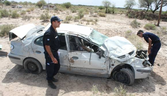 María Uliarte, que tiene su casa a la altura del km 475 de la ruta 20, contó que estaba regando a eso de las 9.30 y escuchó un fuerte golpe: ‘cuando miré a la ruta ya venía el auto dando vueltas de punta entre la polvareda’. El coche era un Renault Megane, que quedó a 50 m de la banquina. El vuelco ocurrió a 5 km al Noroeste de El Encón y fue fatal para Liliana Isabel Espíndola (56), quien murió con el cinturón de seguridad puesto en el asiento del acompañante. Emiliano Blanes, su concubino y conductor del vehículo, sufrió heridas leves, informaron el oficial Abel Soria y el agente Fernando González de la Seccional 32da, que trabajaron en el lugar. La pareja es oriunda del departamento mendocino de San Martín. Blanes no sabía cómo se originó el accidente, sólo recordó que venían tomando mate, dijo Uliarte.