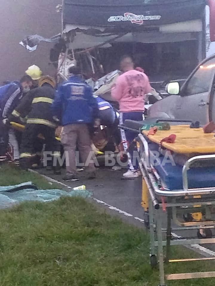 “El camión cruzó de frente y el chofer del colectivo pegó el volantazo, cruzó de carril e impactó contra el auto y la camioneta. El colectivero nos salvó la vida, actuó rápido”, sostuvo un viajero que iba en la parte de arriba del micro, vio todo el suceso y lo relató al móvil de Francisco Paz, en “Mañana es Tarde” de Lafinur FM Radio.