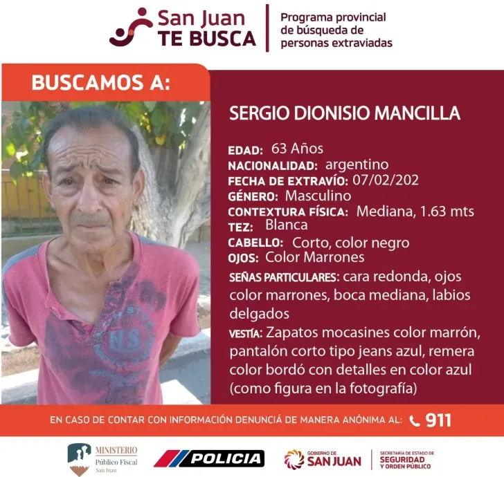 A través del programa provincial de búsqueda de personas extraviadas “San Juan Te busca”, informaron sobre la desaparición de un hombre de 63 años, quien falta a su casa desde el viernes 7 de febrero.