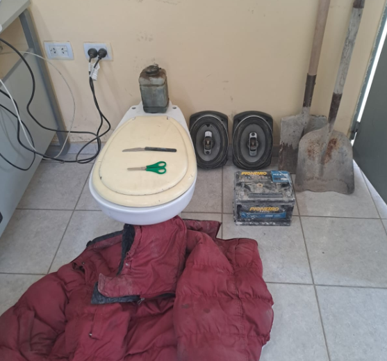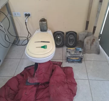 Según informaron, Germán Gabriel Masman, de 28 años, fue sorprendido con un inodoro de cerámica blanco con su tapa correspondiente, dos palas, una batería de automóvil y dentro de una bola transportaba dos parlantes de vehículo.