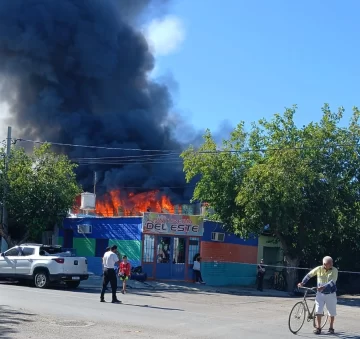 Un incendio de grandes proporciones se registra este viernes en Caucete en una distribuidora de calle Bernardino Rivadavia, entre Laprida y Rawson. Bomberos trabaja intensamente para evitar que el fuego alcance una pinturería contigua.