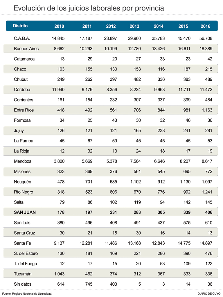 21,9 Es el porcentaje de crecimiento de la litigiosidad laboral en el país en el 2016, respecto al año anterior. En ese lapso se pasó de una tasa de 139,1 a 169,5 juicios cada mil siniestros notificados.
