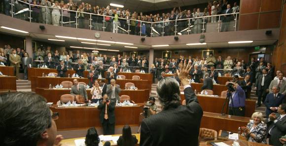 Fue en este punto que primero el diputado Eduardo Bustelo y luego toda la bancada justicialista y hasta los legisladores bloquistas se levantaron de sus bancas para aplaudir al mandatario, mientras desde la bandeja le gritaban "fuerza flaco".