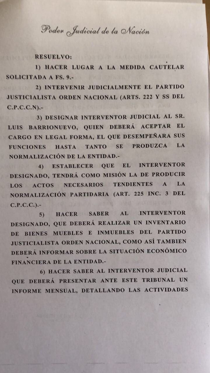 El referente sindical tendrá como tarea “producir los actos necesarios tendientes a la normalización partidaria”. Asimismo, el extitular de la CGT Azul y Blanca “deberá realizar un inventario de bienes muebles e inmuebles del Partido Justicialista Orden Nacional, como así también deberá informar sobre la situación económico-financiera de la entidad”.