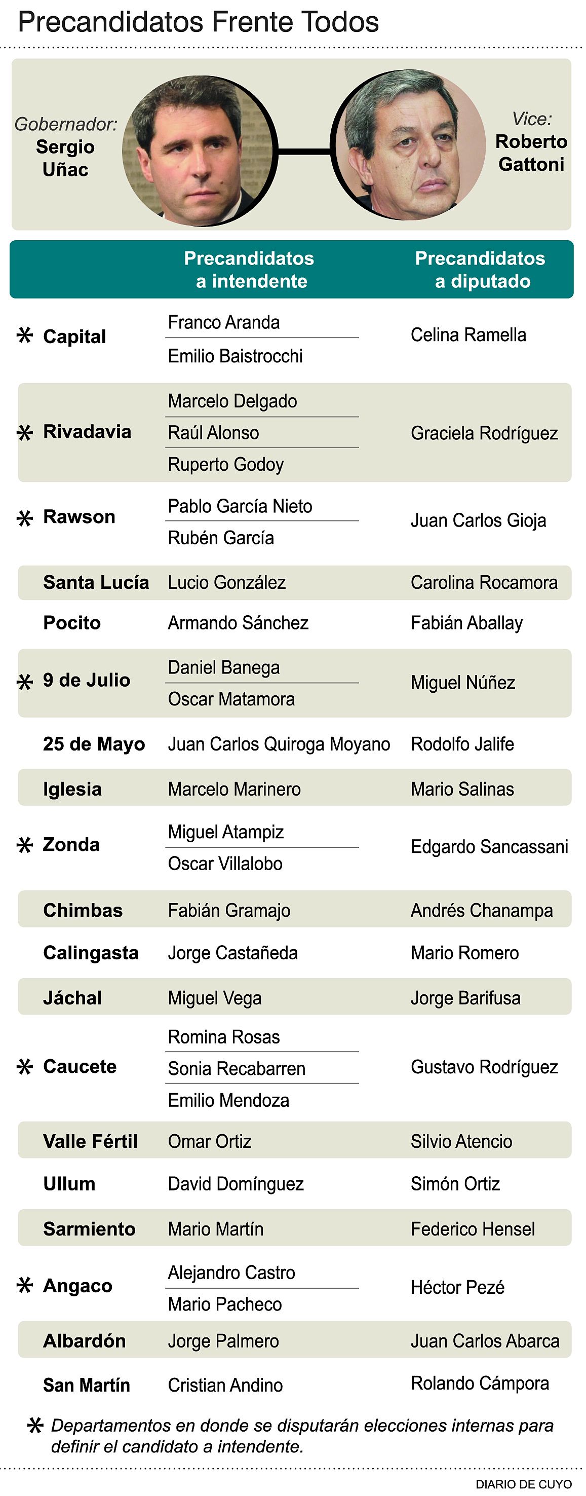 Este medio había adelantado que el que encabeza la lista de diputados proporcionales es el ministro de Minería, Alberto Hensel, quien suena como presidente de la bancada oficialista, debido a que el actual, Pablo García Nieto, compite por la Intendencia de Rawson. En segundo lugar va Fernanda Paredes, que trabaja en la Cámara de Diputados y es miembro de la mesa de mujeres del PJ, cercana políticamente a Uñac. El tercero es Eduardo Cabello, el secretario General de la CGT, quien actualmente es legislador proporcional y desde la central obrera ha venido acompañando decididamente la gestión del Gobernador. En cuarto lugar está la diputada nacional Florencia Peñaloza, que si bien había ganado su banca con el basualdismo, se pasó al interbloque que responde al mandatario provincial. Su incorporación obedece a la sociedad con Mauricio Ibarra, líder de Confe. El quinto lugar fue reservado para el bloquismo y el que también repite en un espacio proporcional es el iglesiano y exintendente Mauro Marinero, tras el respaldo de la titular de la fuerza, Graciela Caselles. En el casillero número seis apuntó a la contención de Leonardo Gioja, quien había ingresado a la Cámara pero como representante departamental de Capital. En esta contienda, esa postulación quedó para Celina Ramella (ver infografía). La séptima ubicación fue para el presidente del Concejo Deliberante de Pocito y familiar de Uñac, José Luis Esteve. El octavo escalón también sirvió de contención para el giojismo, ya que va Graciela Seva, exsecretaria de José Luis Gioja y actual legisladora. En el puesto nueve va Juan José Chica, líder de las 62 Organizaciones Peronistas, el brazo político del gremialismo. En el décimo espacio figura Gastón Berenguer, integrante del triunvirato de la Juventud Peronista y en el peldaño número 11, Horacio Quiroga, del kirchnerista Frente Grande.