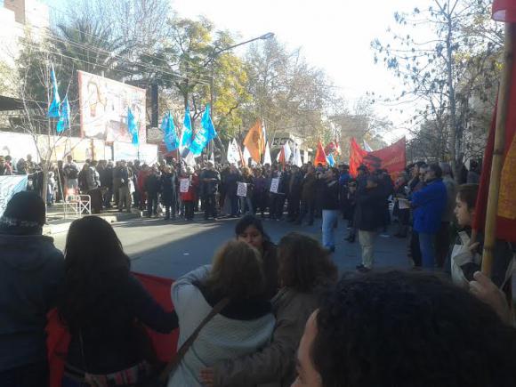 San Juan, 25 de julio.- Tal como estaba previsto, distintas Agrupaciones sociales y por los Derechos Humanos se reunieron frente al Juzgado Federal. El grupo se solidarizó con Alberto Rivas, testigo del juicio, quien sufrió un atentado en su domicilio, y pidió que se acelere la investigación para dar con los dos represores fugados hace un año.