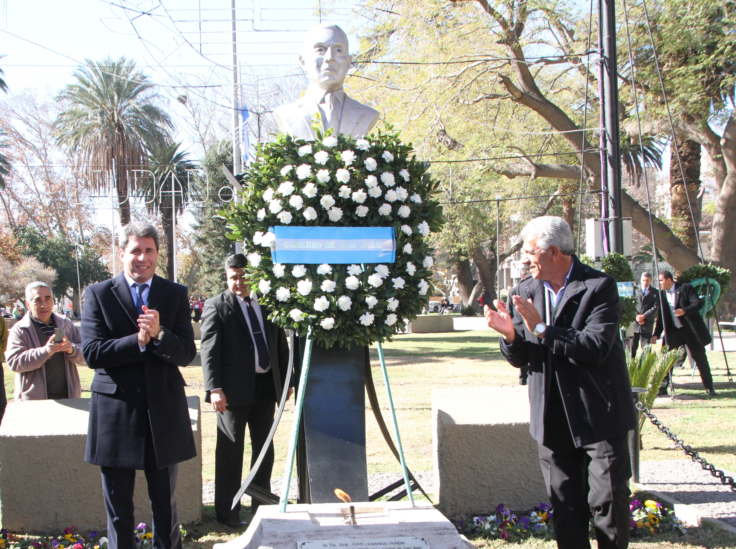 Ofrenda. Como presidente del Partido Justicialista y como gobernador, Sergio Uñac encabezó los actos por Perón. El presidente del partido a nivel nacional, José Luis Gioja, fue unos de los ausentes por presentar problemas en su salud.