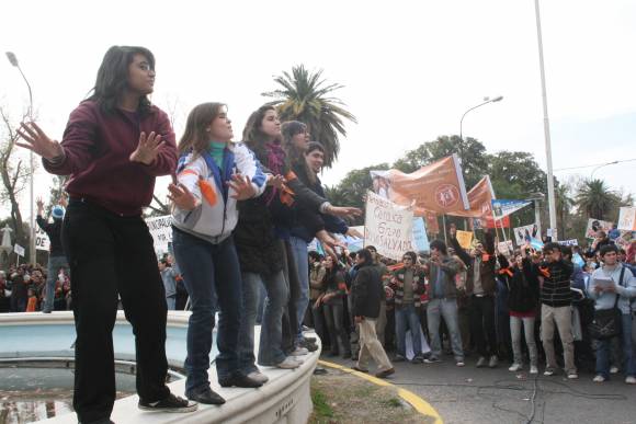 Pero nada generaba tanta adhesión como la Canción por la Familia. Uno de los jóvenes de la organización, que tenía un gorro de lana con los colores de la Bandera Nacional, hizo en la rampa del escenario (para ser visto desde lejos) los pasos que se ve en el video musical del tema original. Y al rato todo el mundo estaba siguiendo esa coreografía. Un poco más tarde, con una nueva vuelta de la canción, algunas adolescentes se treparon a la fuente e imitaron los mismos movimientos, que eran reproducidos como olas por los manifestantes. Sólo la entonación del Himno Nacional, con los legisladores e intendentes sobre el escenario, marcó un cambio de ritmo en una mañana signada por los compases de la música mundialista, en sintonía con el mensaje de "sí a la familia" y "no al matrimonio gay".