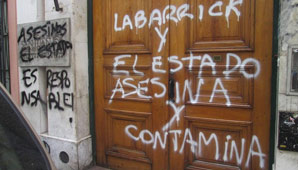 Buenos Aires.- Las enormes puertas de madera y el mármol de la fachada de la Casa de San Juan en Buenos Aires aparecieron llenos de graffitis con inscripciones en contra del desarrollo minero. El hecho fue criticado por las autoridades de la institución, quienes ya trabajan limpiando los muros.