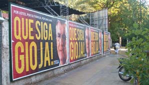 Acompañados por la frase "Por usted, por su familia, por San Juan: Que siga Gioja!" algunos de los carteles pueden encontrarse en calle Entre Ríos, metros después de Mitre.