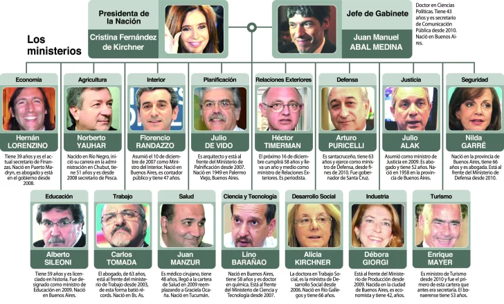 Trece de los dieciséis ministros continuarán en sus cargos y sólo tres hombres nuevos se incorporarán a ese rango: Juan Manuel Abal Medina desembarca como nuevo jefe de Gabinete, Hernán Lorenzino, hombre de extrema confianza de Amado Boudou, será finalmente el ministro de Economía, y Norberto Yahuar conducirá la cartera de Agricultura -ver infografía-.