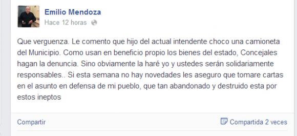 El exjefe comunal utilizó su cuenta de Facebook para denunciar lo ocurrido y aseguró “usan en beneficio propio los bienes del estado”. Además, pidió a los concejales denunciar formalmente el hecho. “Concejales hagan la denuncia. Sino obviamente la haré yo y ustedes serán solidariamente responsables.. Si esta semana no hay novedades les aseguro que tomare cartas en el asunto en defensa de mi pueblo”, escribió.