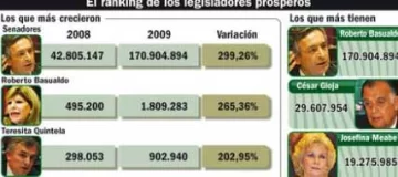 Entre los cinco que más crecieron encabeza la lista el sanjuanino Roberto Basualdo, seguido por senadores de distintos colores políticos como el ultrakirchnerista Jorge Banicevich o el jefe del bloque radical Gerardo Morales. Los porcentajes se calcularon comparando los bienes de las dos últimas declaraciones patrimoniales, que fueron completadas por los propios legisladores y que PERFIL solicitó a la Secretaría Administrativa del Congreso.