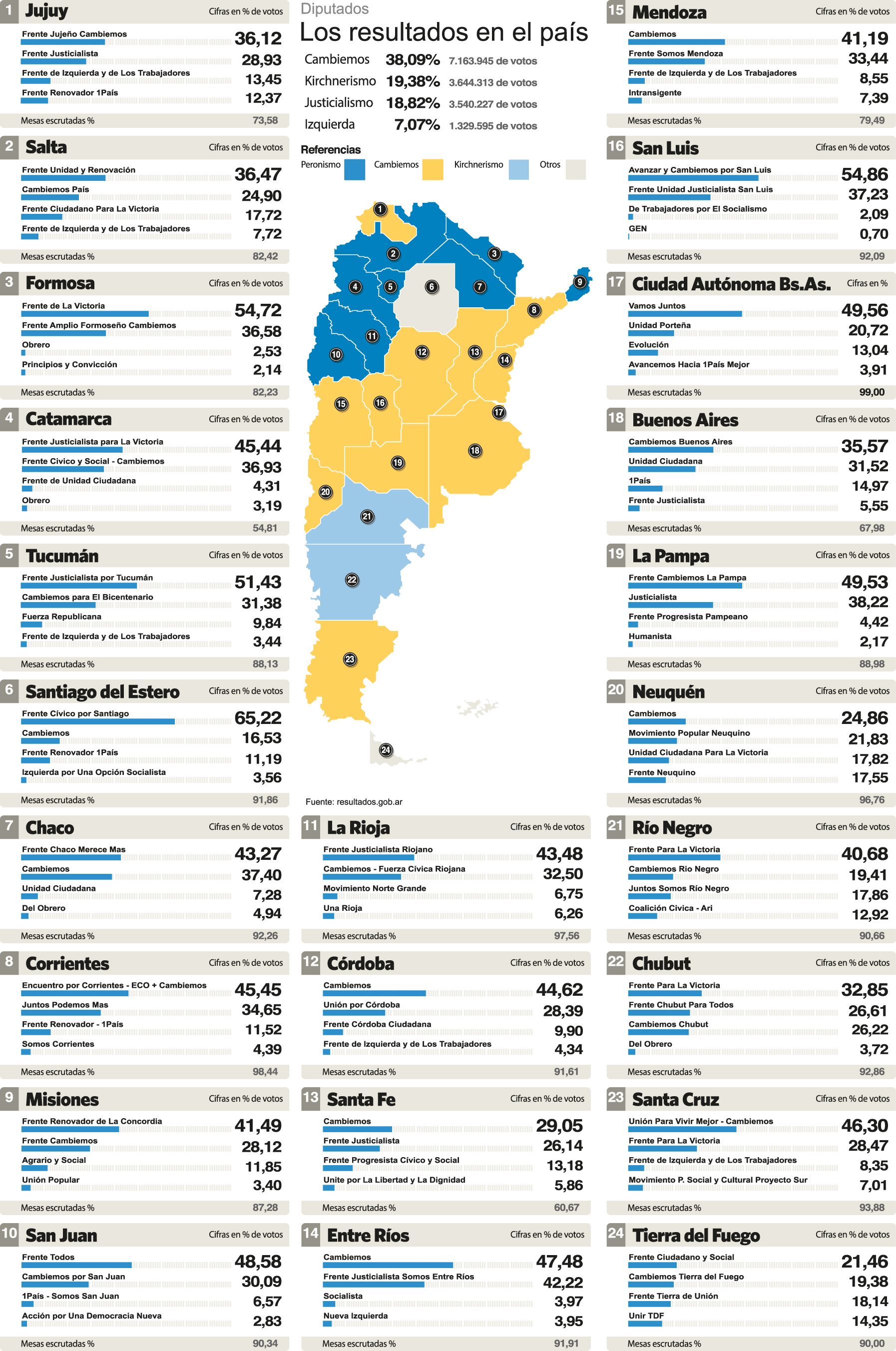 El oficialismo obtenía la victoria en Buenos Aires, Jujuy, San Luis y Santa Cruz, mientras que el PJ logró la victoria en Formosa, San Juan y La Rioja y el Frente Renovador de la Concordia, una expresión provincial, se mantuvo al frente de los cómputos en Misiones.