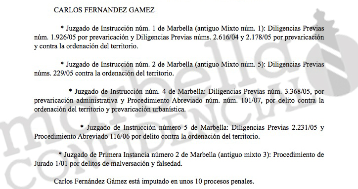 Fue el extitular del Juzgado de Instrucción 5 de Marbella Miguel Ángel Torres, entonces instructor del ‘caso Malaya’, quien plasmó en el folio 85 del auto de procesamiento, dictado en julio de 2007, todas la causas en las que el exconcejal del GIL (1991-1998) y Partido Andalucista (1999-2005) figuraba imputado.
