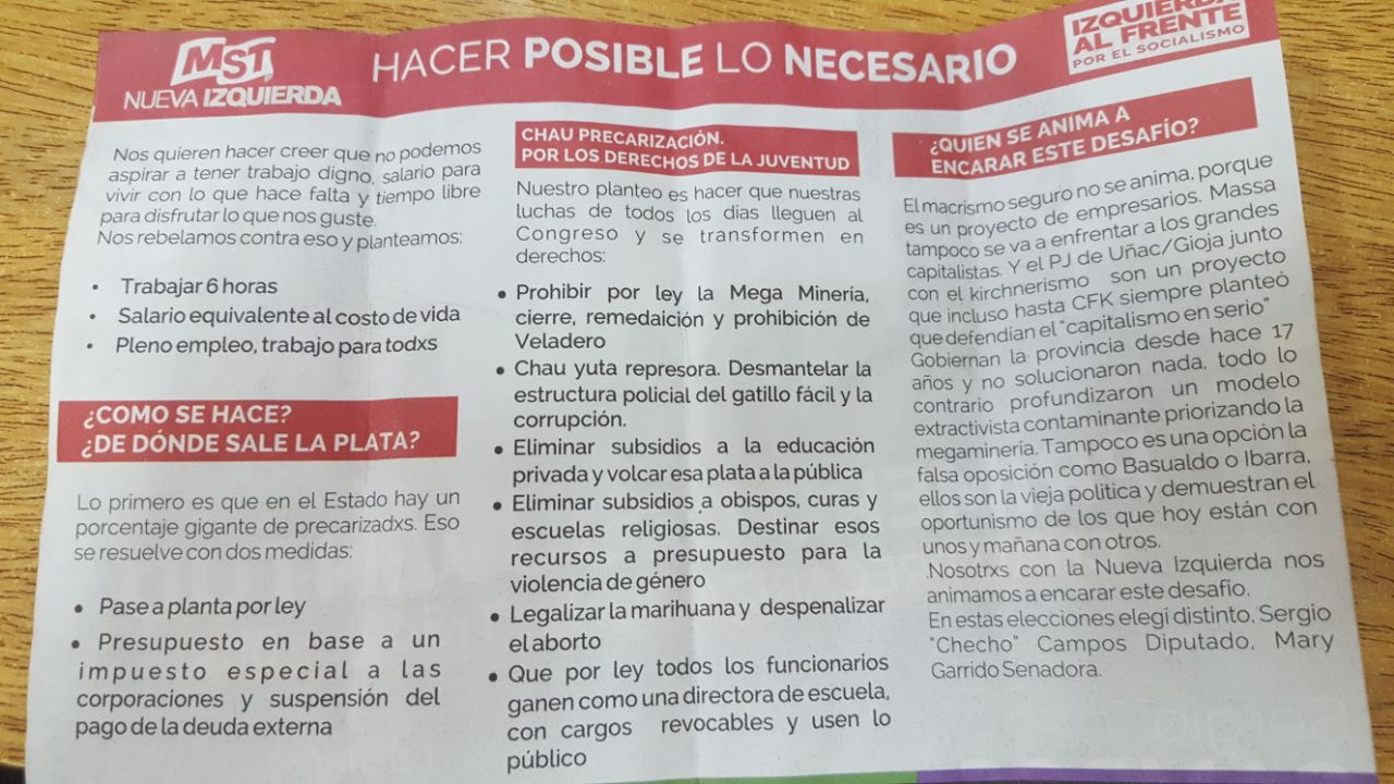 En las últimas horas, el Movimiento Socialista de los Trabajadores, Nueva Izquierda de San Juan, repartió folletos en los que, entre otras cosas, exigen "trabajar 6 horas por día, salarios equivalentes al costo de vida y trabajo para todos".