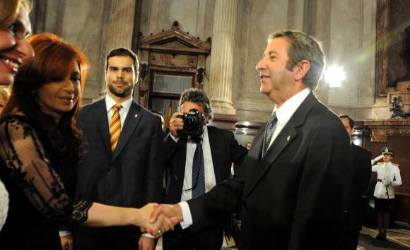 El dirigente radical de Mendoza estuvo de pie en silencio, con su porte erguido y serio, a las espaldas de Cristina Fernández, mientras duró la ceremonia de traspaso de poder y se retiró inmediato. Pasó raudamente por su despacho, donde se encontraban su esposa Cristina Cerutti y su hijo Agustín, y abandonaron el parlamento mientras la Presidenta pronunciaba su discurso.